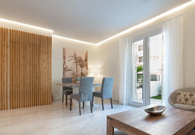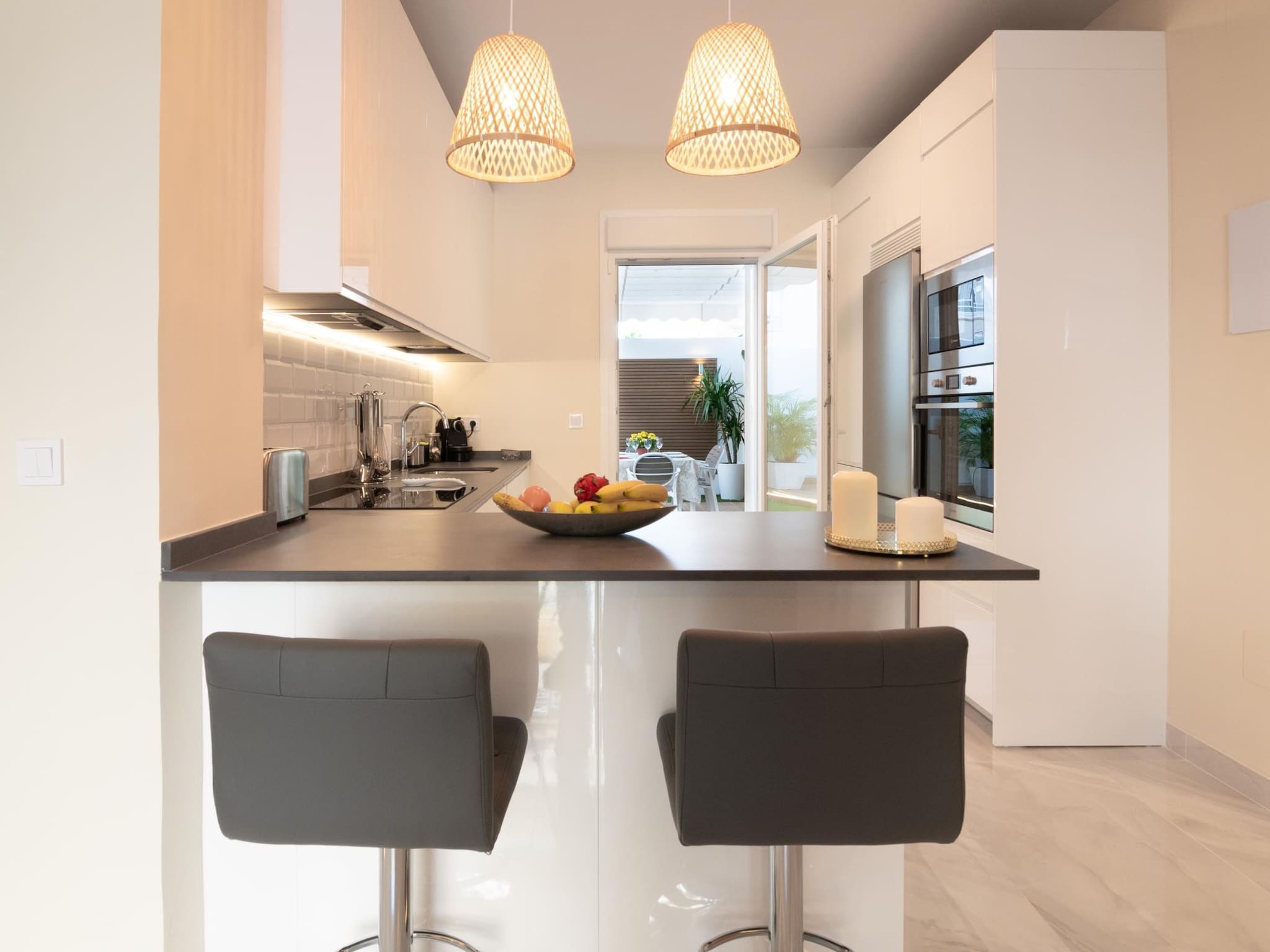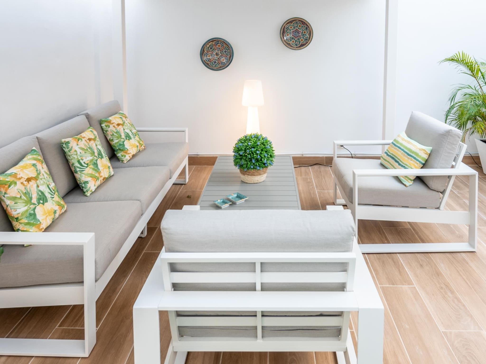 Al acceder desde la calle, nos recibe una de las dos terrazas privadas, que conduce a un elegante salón-comedor de diseño contemporáneo, equipado con Smart TV y decorado con gran estilo. La cocina de concepto abierto está completamente equipada con electrodomésticos de alta gama, ideal para largas estancias y proporcionando todo lo necesario para que los huéspedes se sientan como en casa. Desde la cocina se accede a la segunda terraza privada, diseñada como un oasis de relax, con una acogedora zona de chill out, comedor al aire libre y césped artificial, todo decorado con esmero para disfrutar de agradables momentos al aire libre.