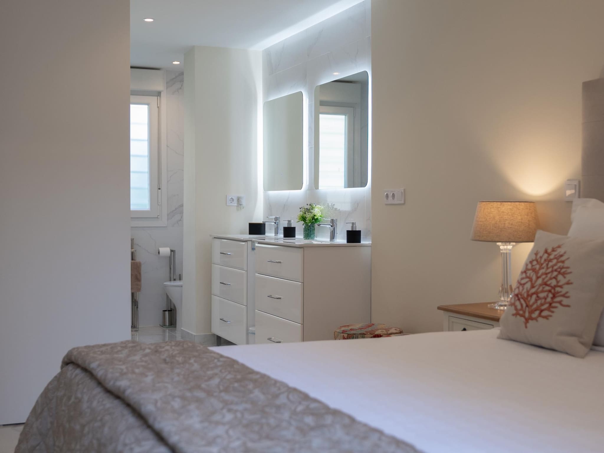 El dormitorio principal, con orientación sur, cuenta con una cama doble, televisión, un amplio armario y acceso directo a la terraza. El baño en suite de estilo semiabierto destaca por su modernidad, con acabados de alta calidad y una amplia ducha. El segundo dormitorio, también orientado al sur, ofrece dos camas individuales de 90 cm, armario empotrado y mucho espacio para el confort de los huéspedes. La propiedad incluye además un segundo baño independiente con ducha, moderno y funcional.