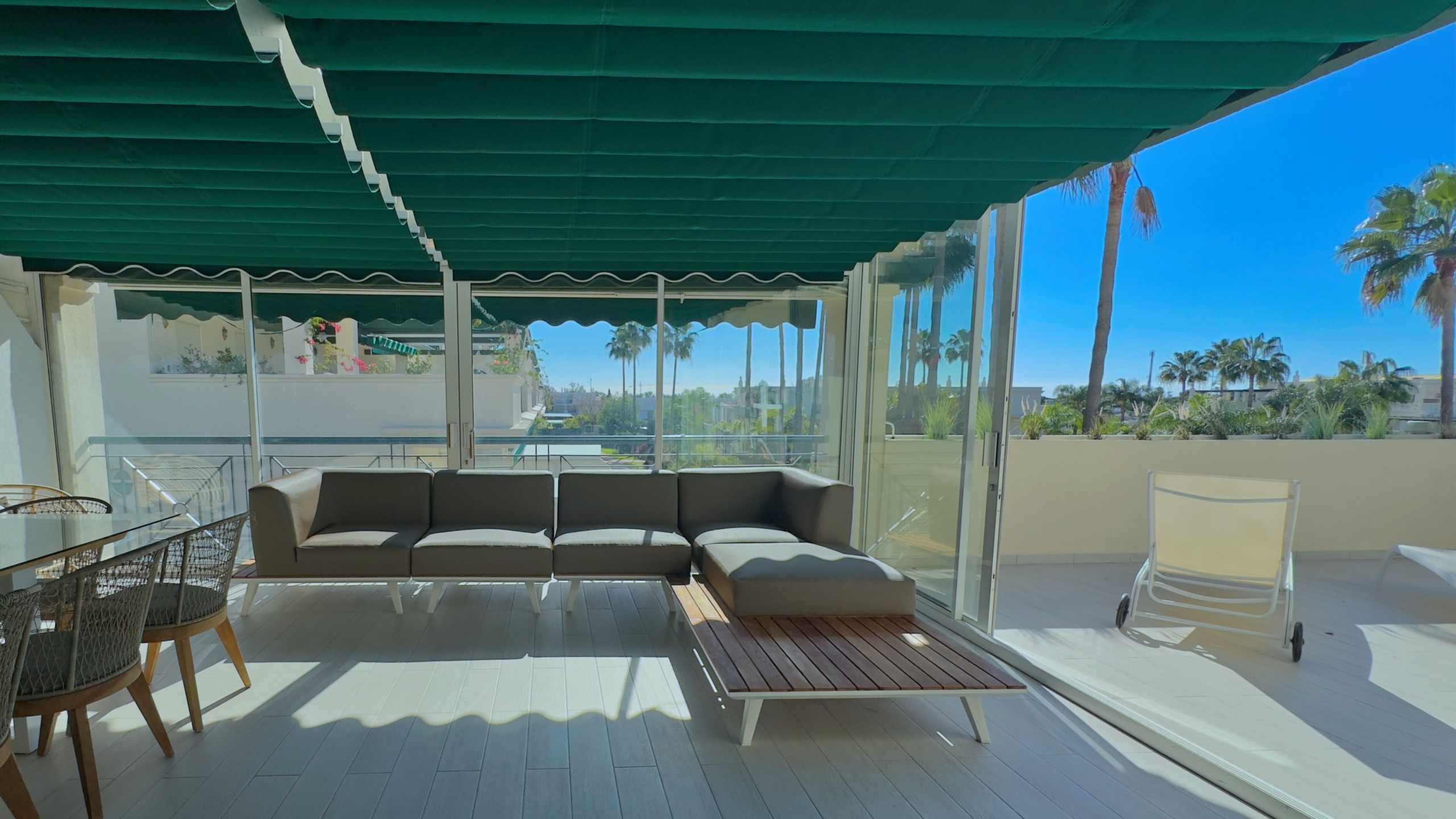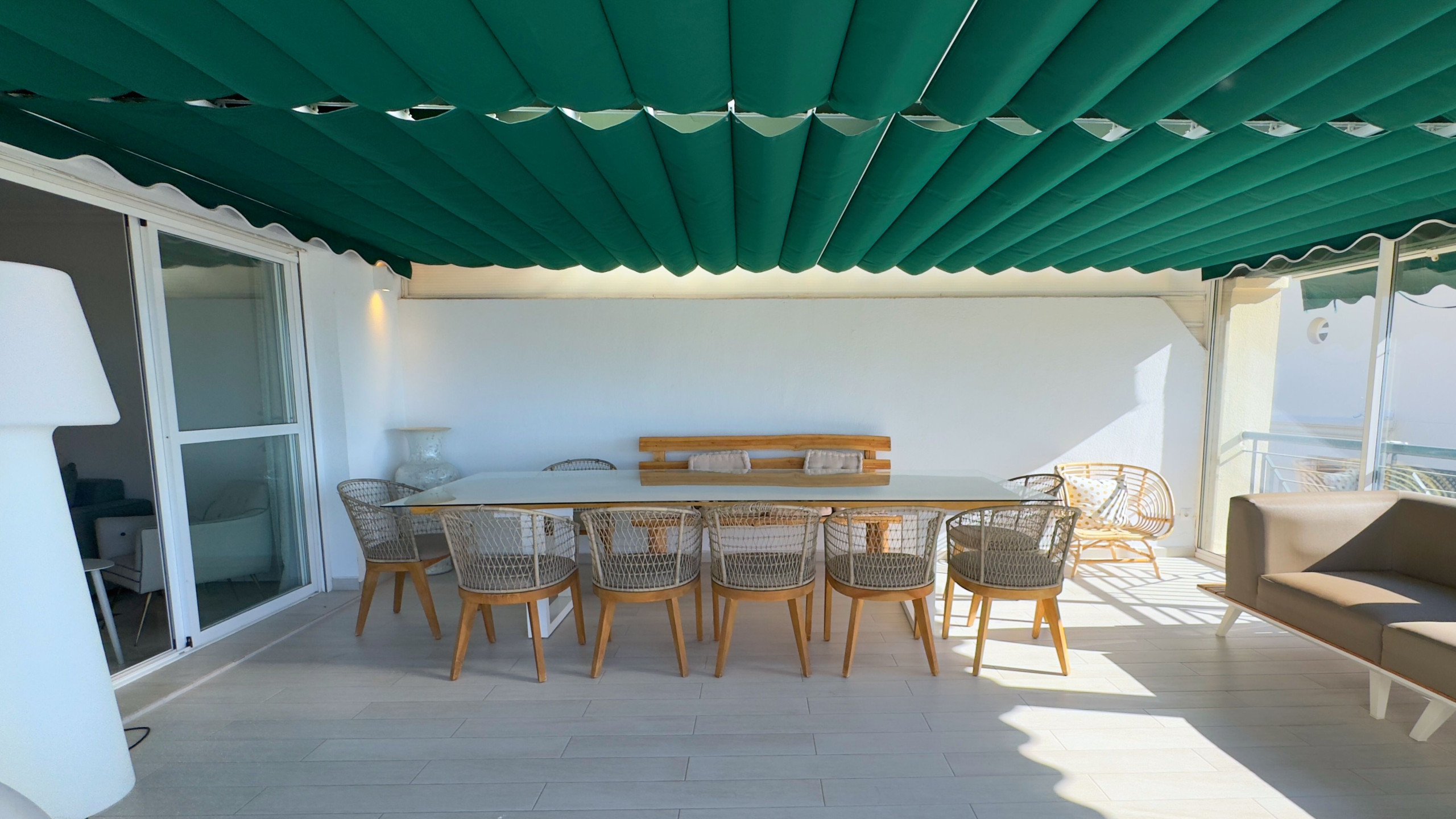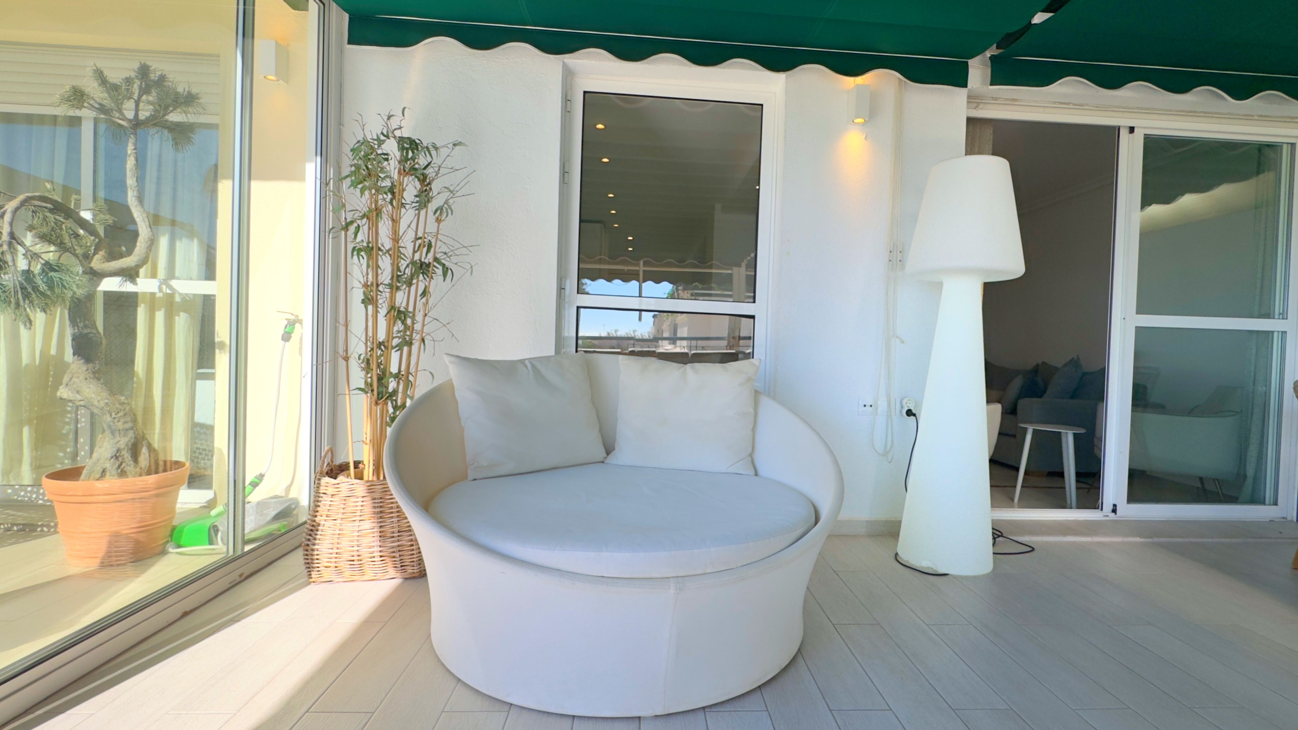 El salón te lleva a una maravillosa terraza acristalada, equipada con una zona de comedor y un espacio chill out, perfecta para relajarte mientras disfrutas de las vistas a los jardines y piscinas comunitarios. La terraza también tiene una zona descubierta con hamacas, ideal para tomar el sol durante todo el día, gracias a su orientación sur.