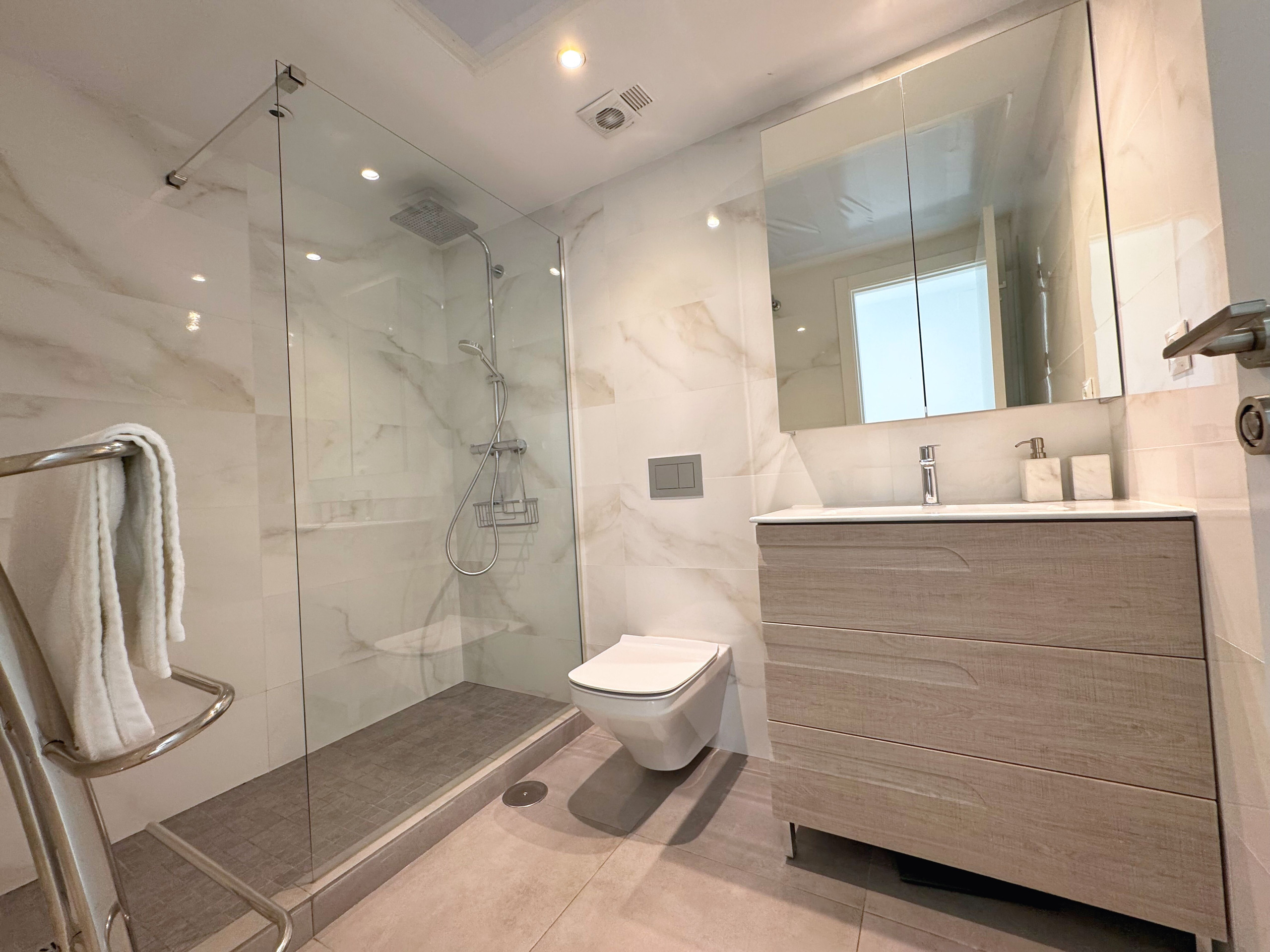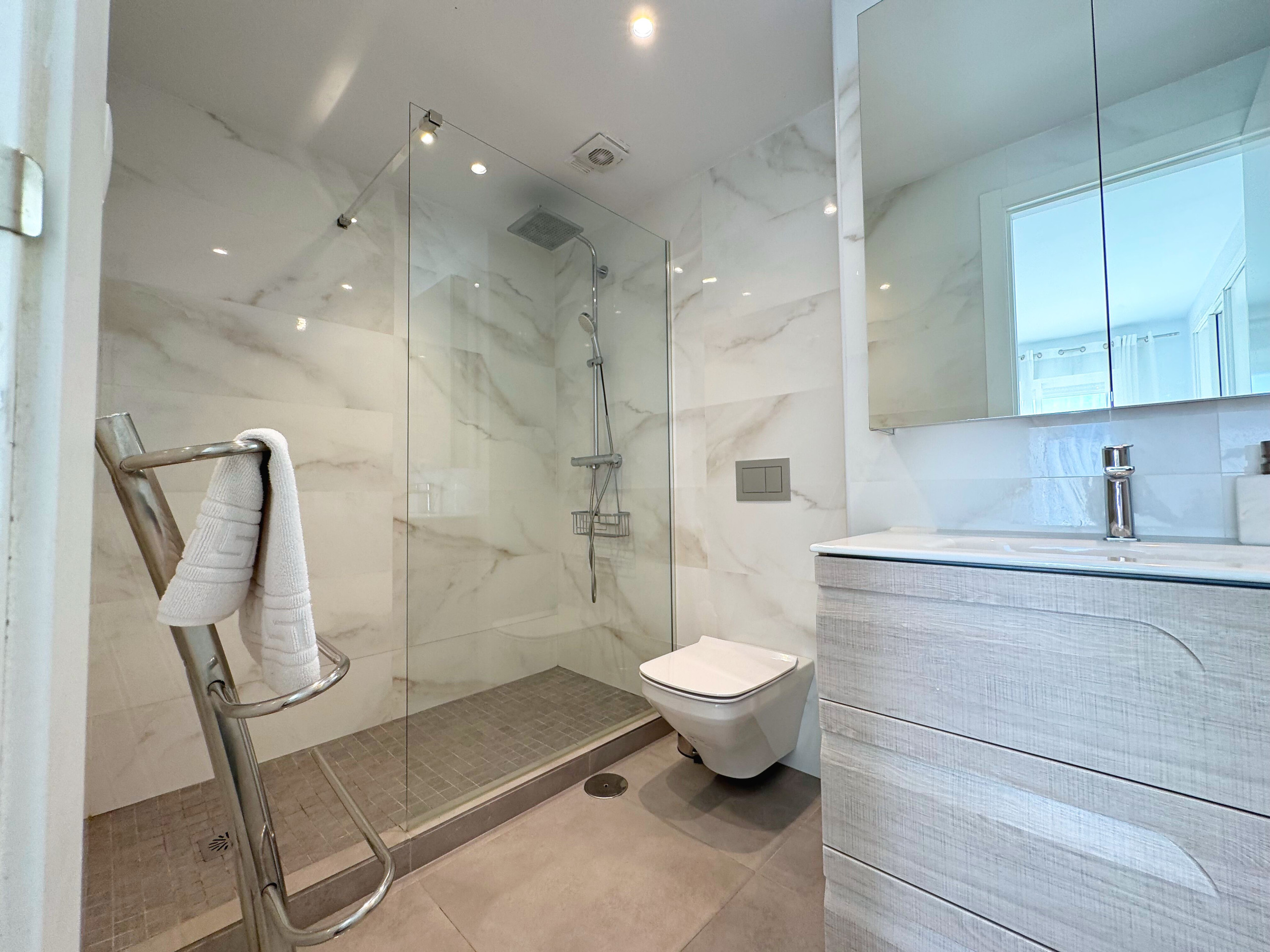 El dormitorio principal es un refugio de confort, con una cama doble, un amplio armario y acceso directo a la terraza. Además, cuenta con un moderno baño en suite totalmente reformado, con una elegante ducha. El segundo dormitorio también ofrece comodidad con una cama doble, Smart TV, armario y acceso directo a la terraza. Para mayor conveniencia, el apartamento dispone de un segundo baño completo, también con ducha.