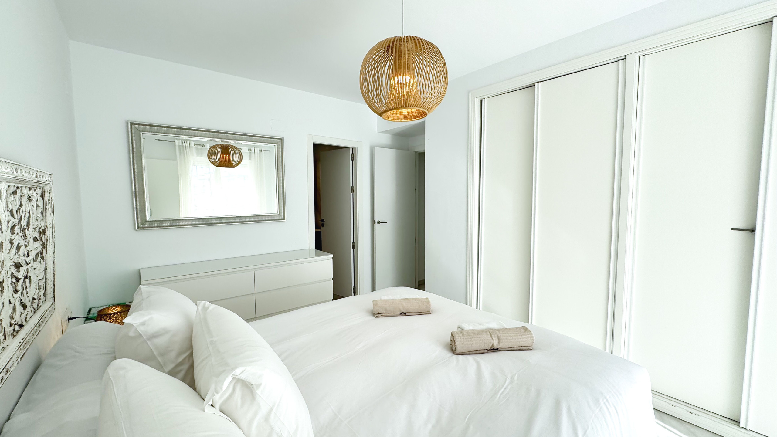 El dormitorio principal, con orientación sur, cuenta con una cama doble, televisión, un amplio armario y acceso directo a la terraza. El baño en suite de estilo semiabierto destaca por su modernidad, con acabados de alta calidad y una amplia ducha. El segundo dormitorio, también orientado al sur, ofrece dos camas individuales de 90 cm, armario empotrado y mucho espacio para el confort de los huéspedes. La propiedad incluye además un segundo baño independiente con ducha, moderno y funcional.