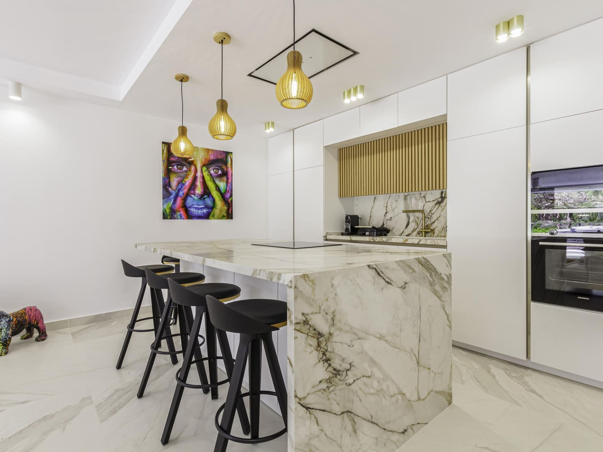 ✔ Cocina de lujo integrada al salón con isla central, equipada con electrodomésticos de alta gama, inducción, extractor empotrado en el techo y frigorífico-congelador estilo americano.