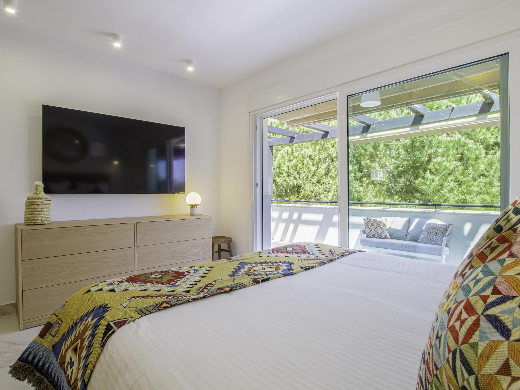 ✔ Dormitorio principal con Smart TV, armarios empotrados, baño en suite con bañera y acceso a una terraza privada con vistas.