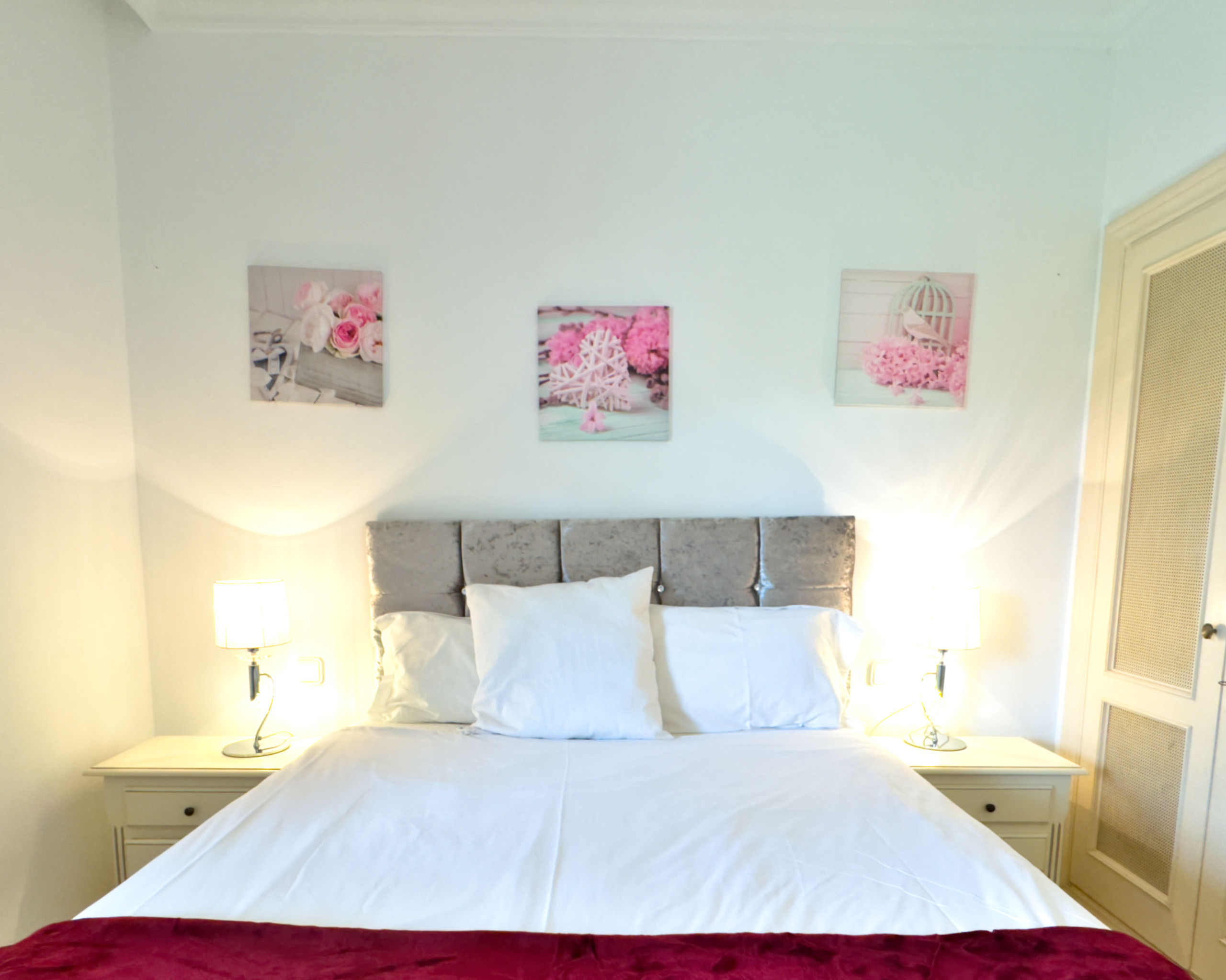 Inside, you’ll find a bright and comfortable living-dining area with a Smart TV, a fully equipped kitchen, and direct access to the terrace. The main bedroom includes a double bed, wardrobe, and an en-suite bathroom with a bathtub and bidet. The second bedroom, also with a double bed and built-in wardrobe, is served by a second full bathroom, also with a bathtub and bidet.