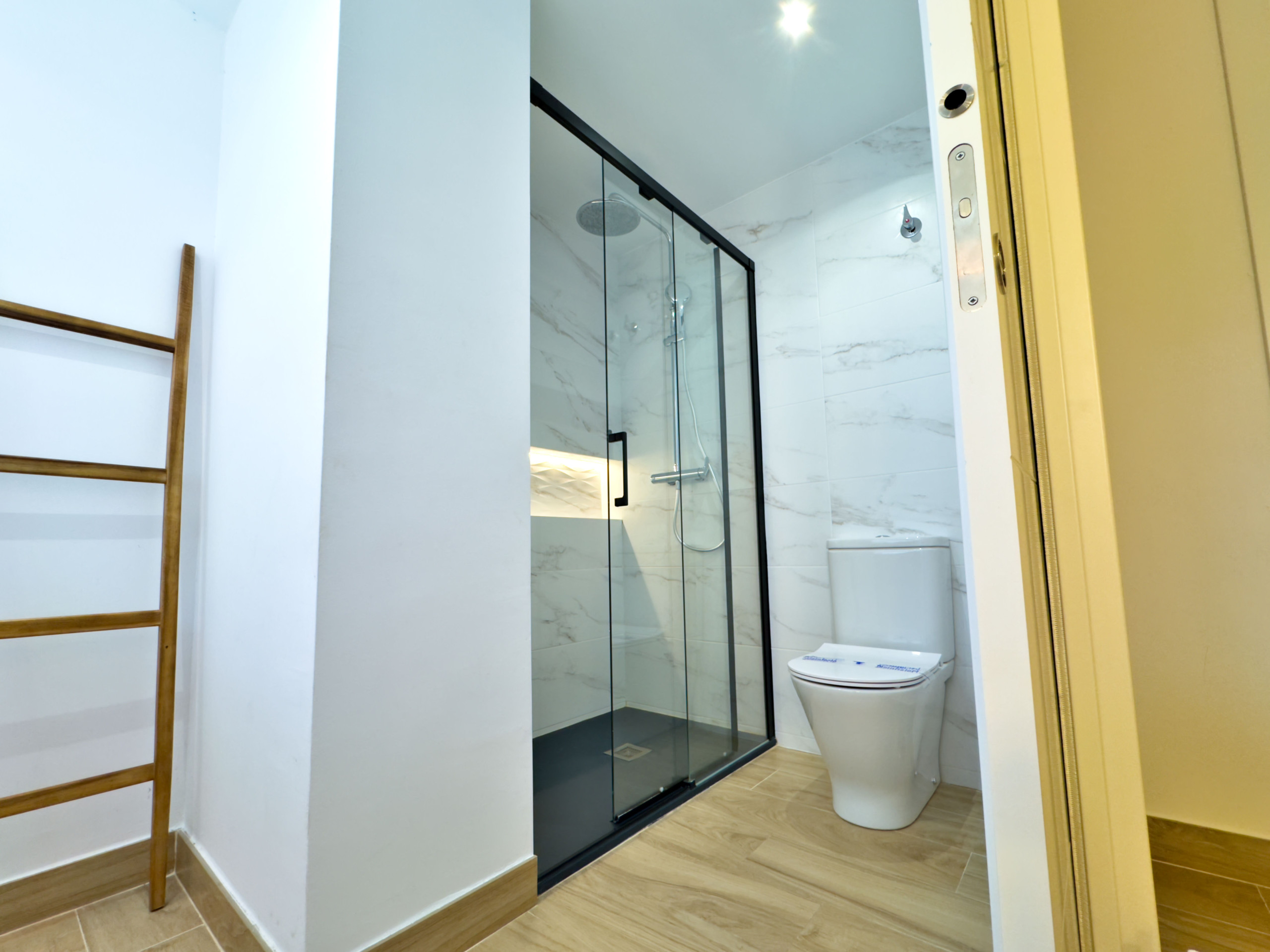 This ground-floor apartment offers excellent accessibility and features two bedrooms and two modern bathrooms with walk-in showers. The master bedroom includes a double bed and an en-suite bathroom with shower, double vanity, and natural light from a window, although the main sleeping area does not have a window. The second bedroom is ideal for families or groups, featuring three single beds (including a pull-out bed) and generous storage space.
