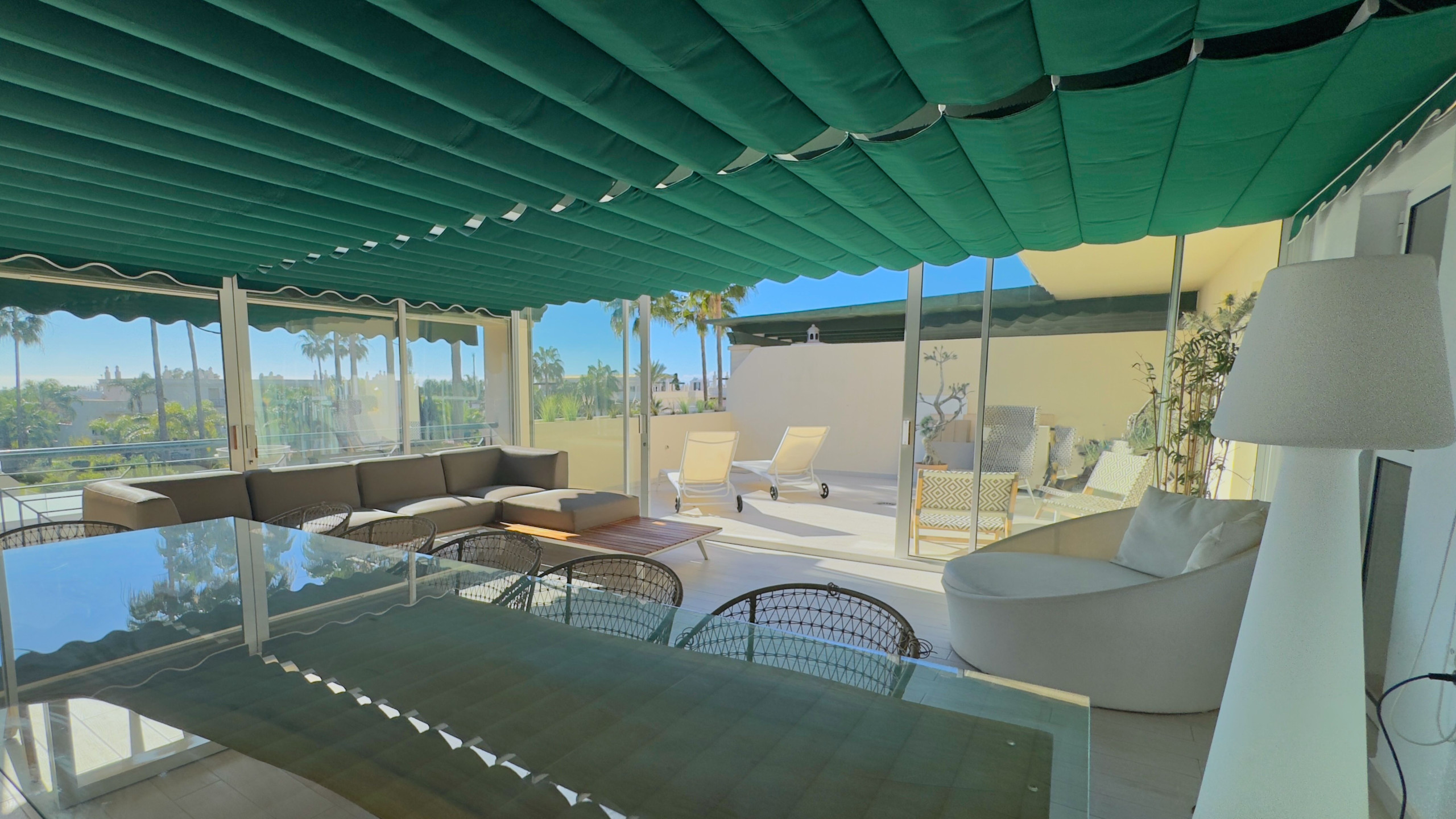 The living room leads you to a beautiful glazed terrace, equipped with a dining area and a chill-out space, perfect for relaxing while enjoying views of the communal gardens and pools. The terrace also has an uncovered area with sun loungers, ideal for soaking up the sun all day long, thanks to its south-facing orientation.