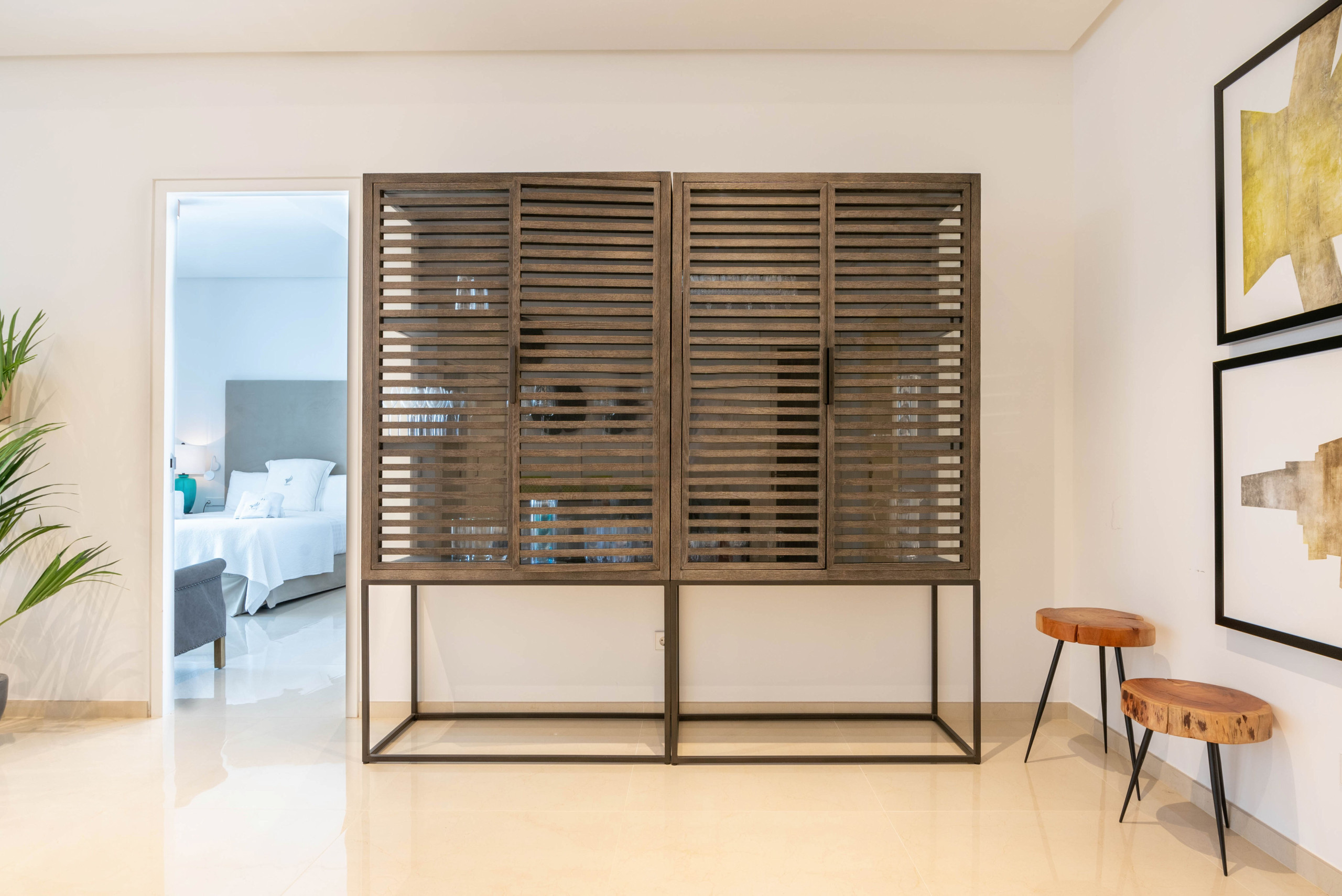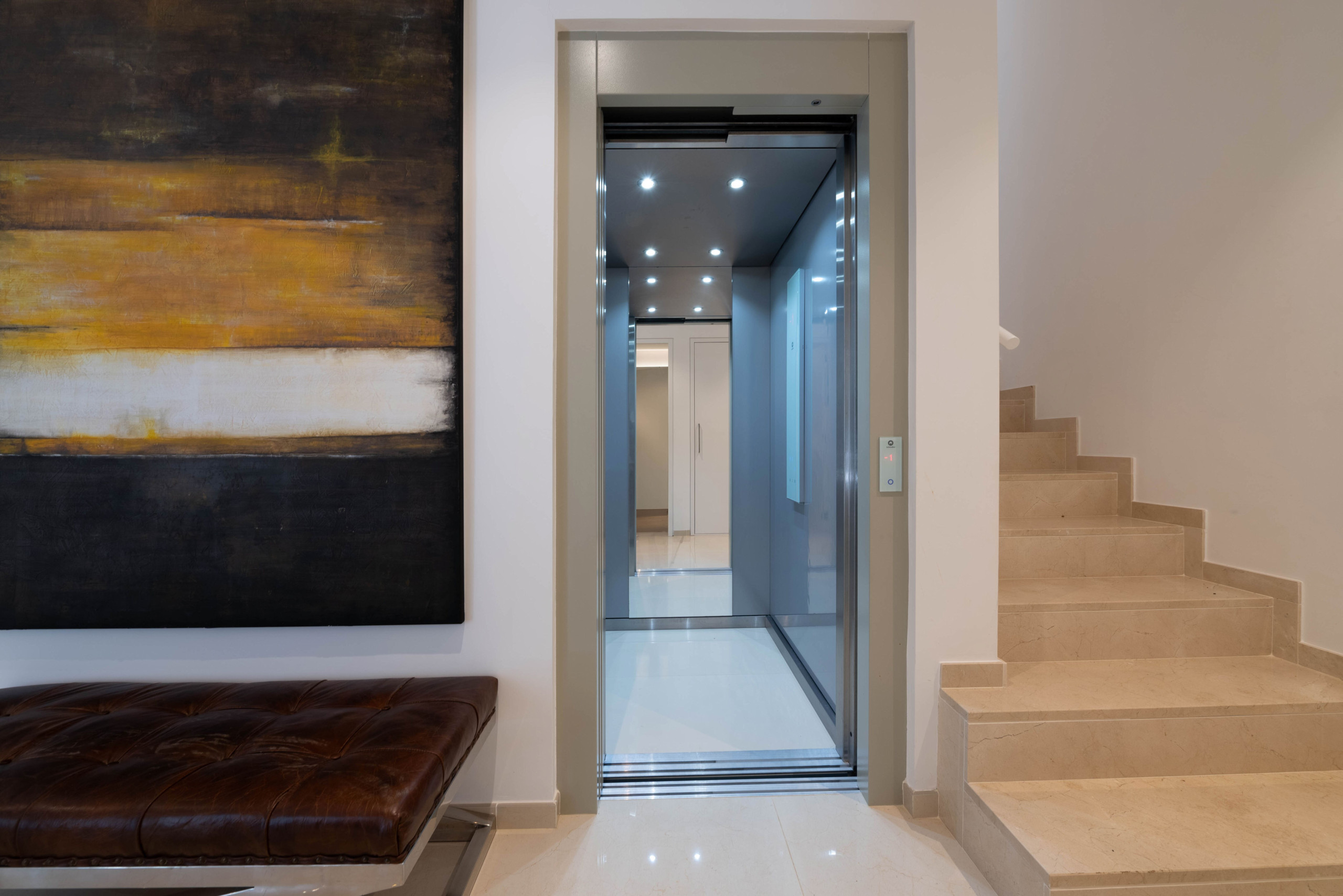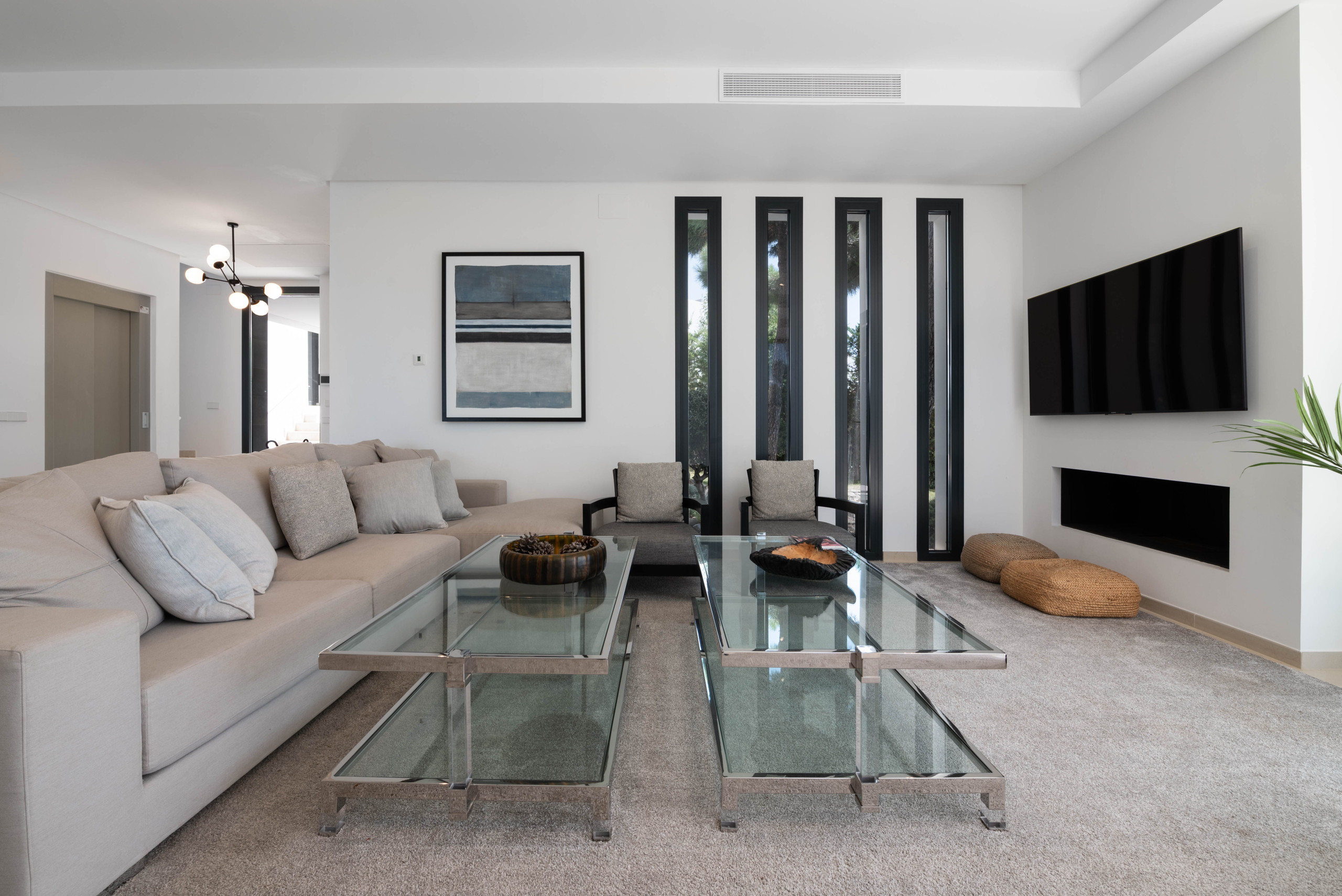 The living room is comfortably furnished, featuring a fireplace, SONOS speaker, smart TV, air conditioning (heating and cooling), and strong WIFI connection. There is also an elevator that takes guests to all floors of the villa. The entire property is equipped with an advanced home automation system, allowing efficient control of lighting, climate, and security systems.