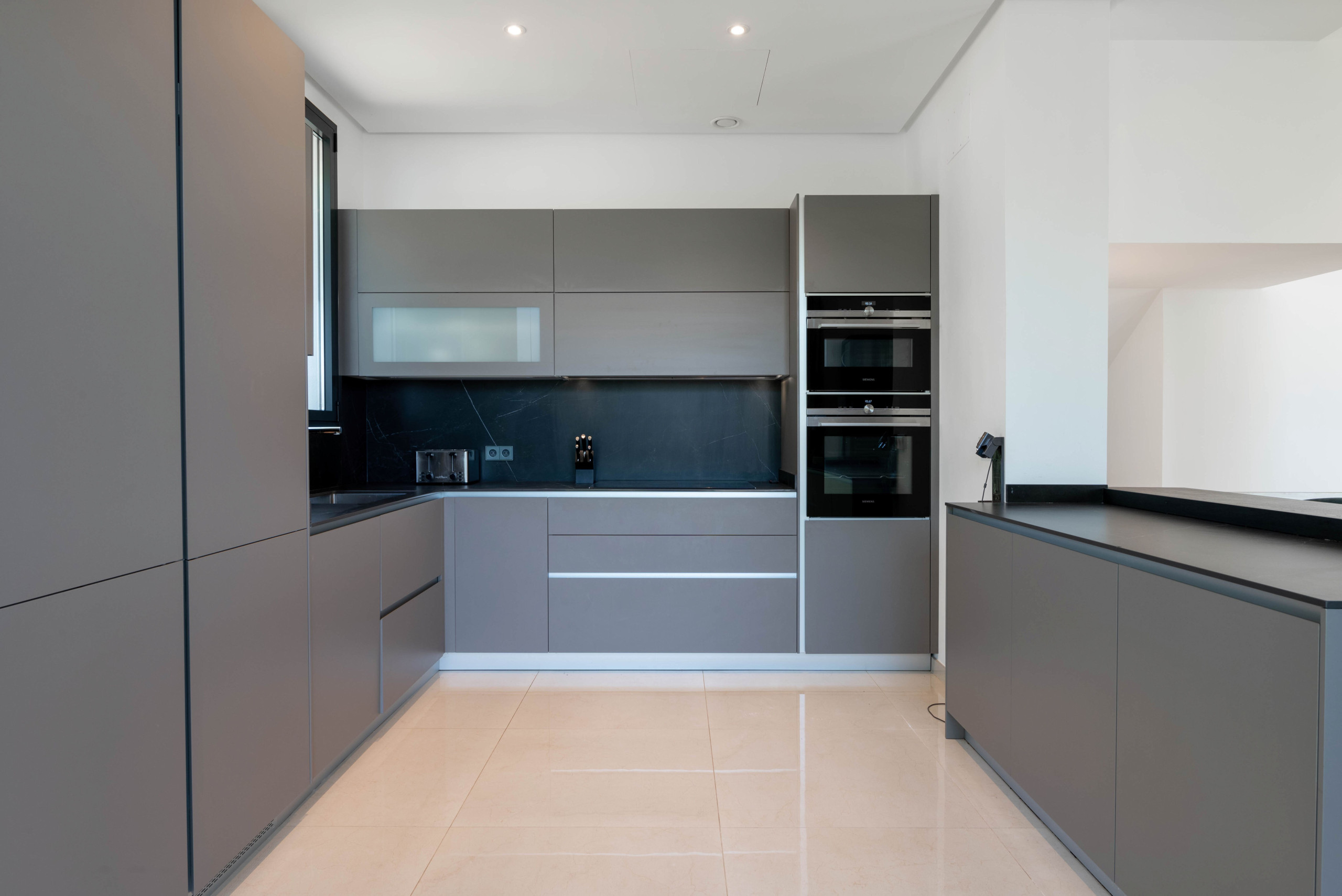 On the first floor, you'll find three bedrooms with private bathrooms, including a master suite with a king-size bed, private terrace, freestanding bathtub, rainfall shower, bidet, underfloor heating, and panoramic sea views. The other two bedrooms also offer queen-size beds, modern bathrooms, and terraces with sun loungers, perfect for relaxing in the sun.