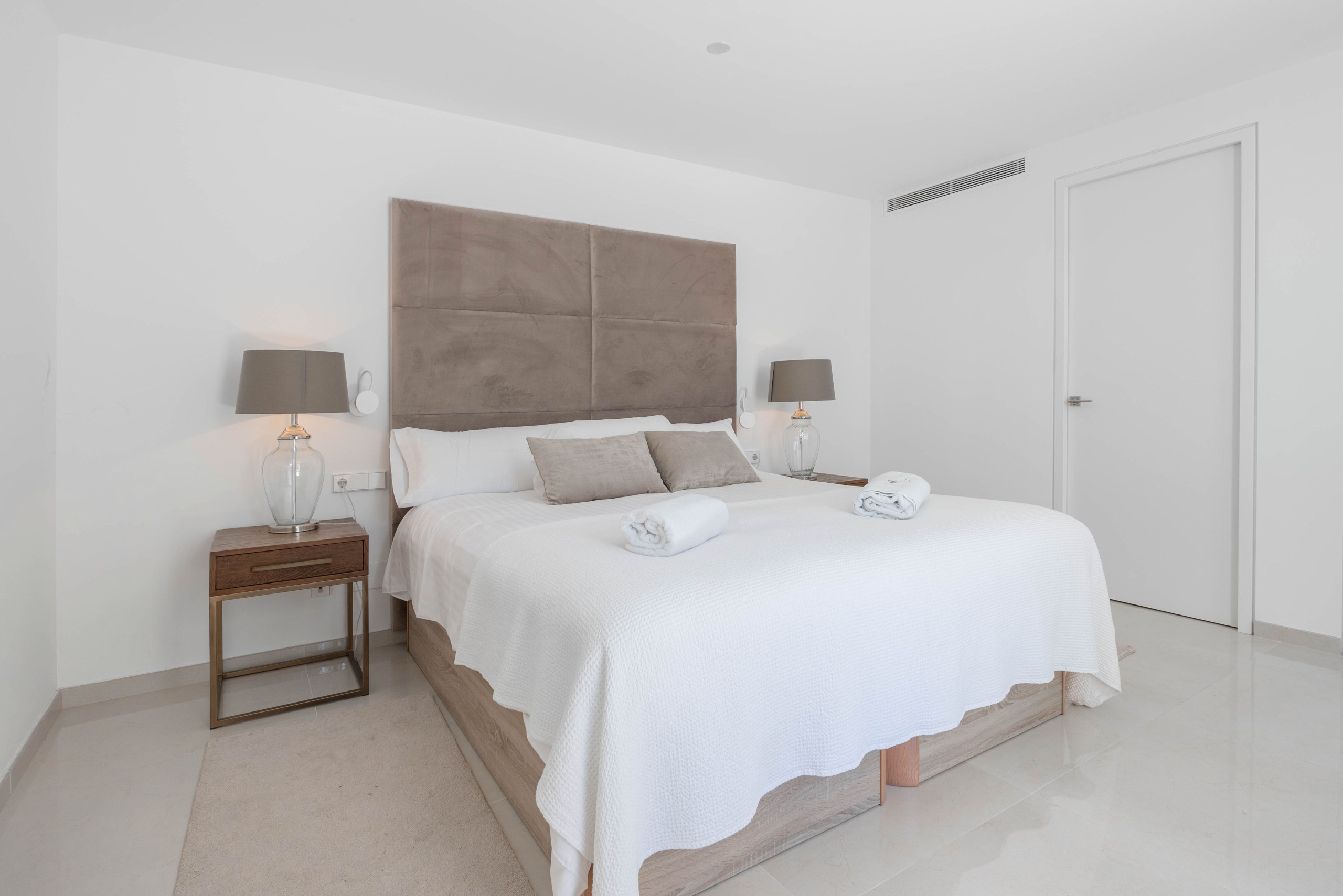 • Second Bedroom: Queen size bed, private terrace with loungers, en-suite bathroom with walk-in shower, and underfloor heating.