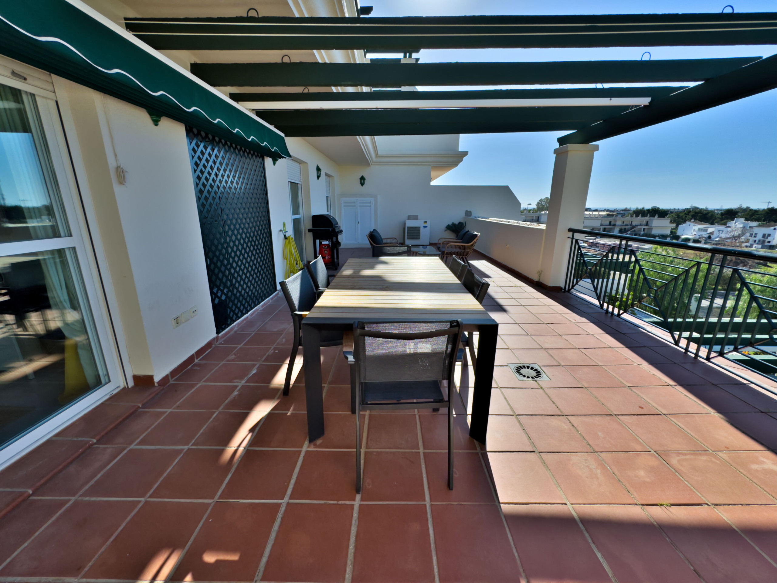 Située au deuxième étage du bloc 8, l'appartement bénéficie d'une orientation ouest, idéale pour profiter du soleil de l'après-midi. Accessible par ascenseur, l’entrée mène à droite au salon-salle à manger, équipé d’une télévision à écran plat et donnant accès à une grande terrasse entièrement aménagée. La terrasse comprend un barbecue, une salle à manger, un coin détente et une vue magnifique sur les jardins et les piscines communautaires.