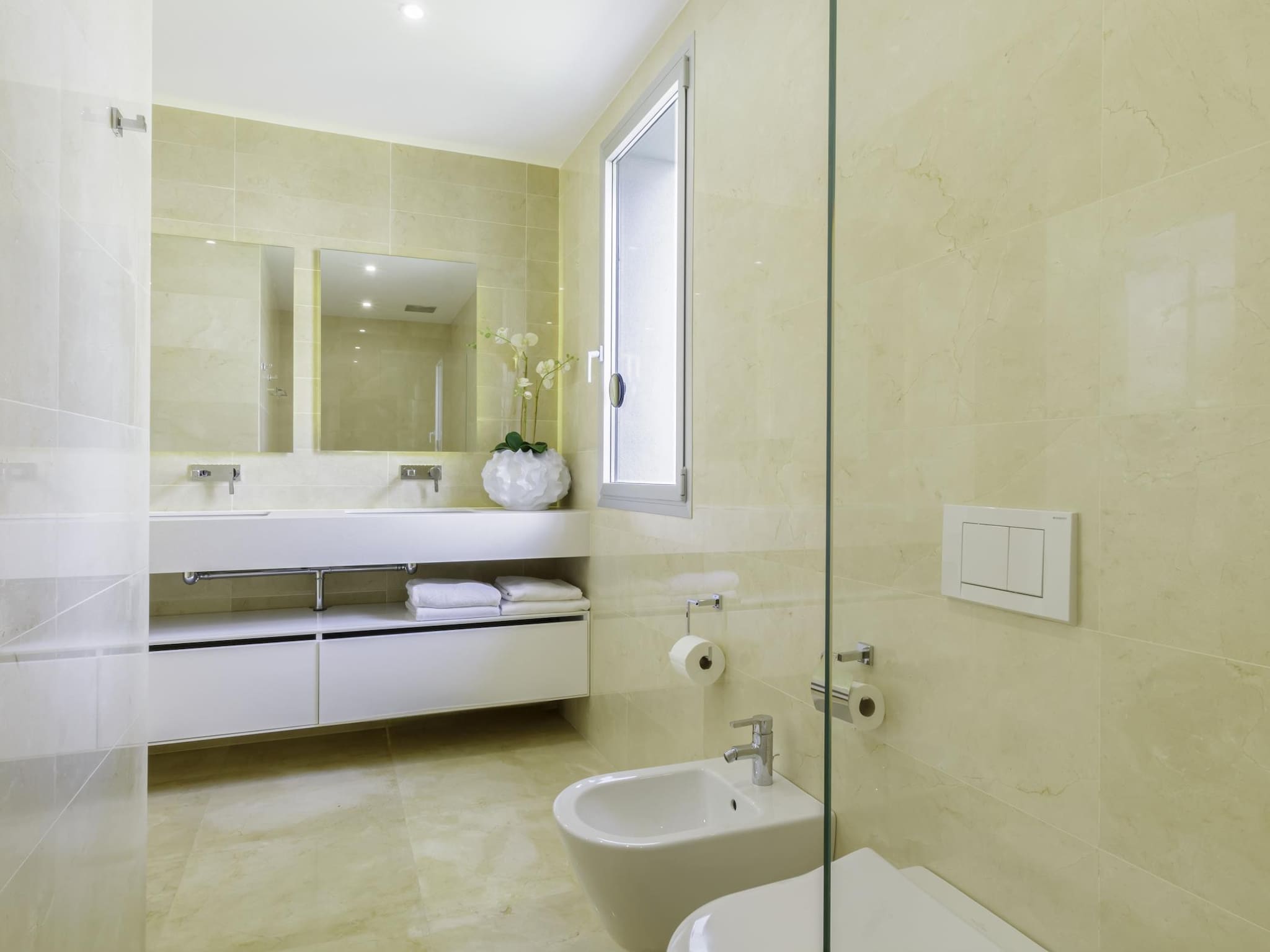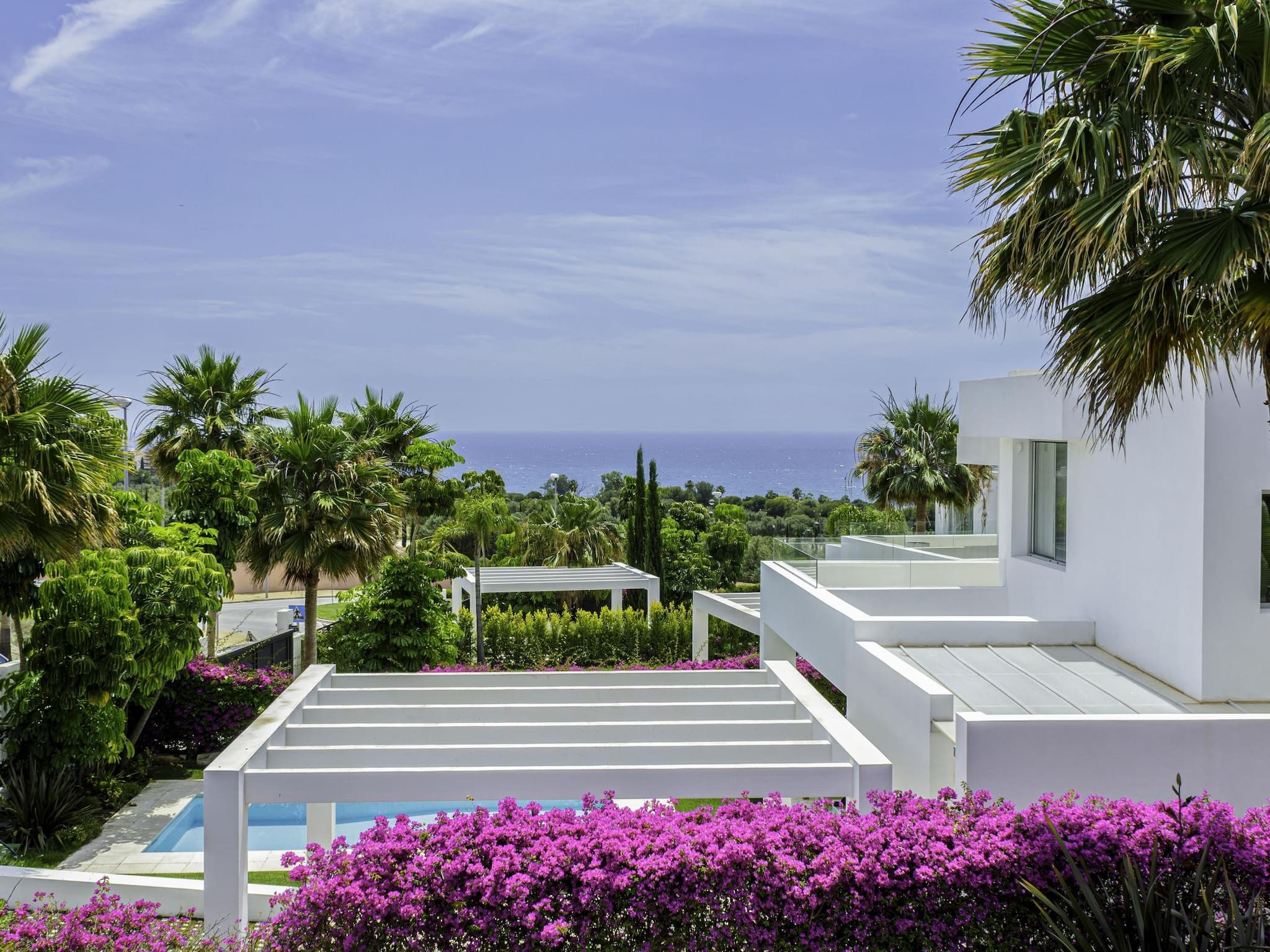 Villa avec vue sur la mer, décorée par un architecte d'intérieur, comprenant trois chambres avec salles de bains en suite et un WC pour les invités,